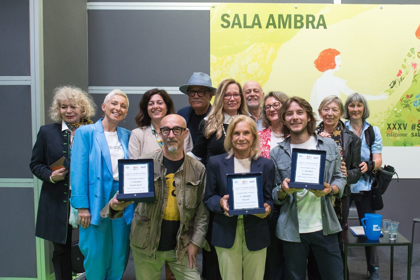 I tre vincitori dell’edizione 2023 del premio letterario sul viaggio indetto dal Gruppo Italiano Stampa Turistica in posa con la giuria. Foto Gisella Motta