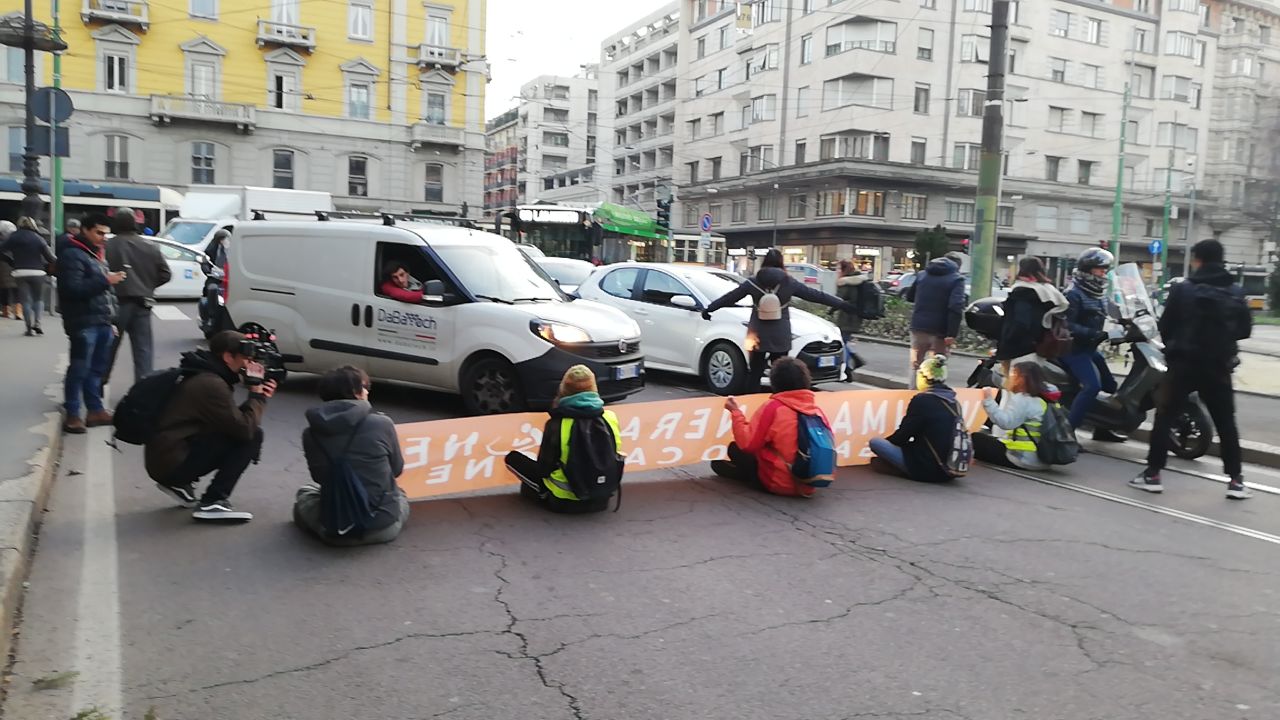 Cinque ragazzi di Ultima Generazione alle 8.30 del 12 gennaio hanno bloccato Piazza Cinque Giornate, luogo simbolo della Resistenza milanese, per chiedere ancora una volta ai governi di cambiare e di dire stop all’utilizzo delle energie fossili perché non c’è più tempo.